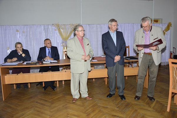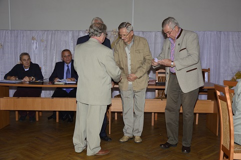 | Piotr Szymczak odczytuje treść życzeń. | Witold Kowalski wręcza życzenia solenizantom. | |||