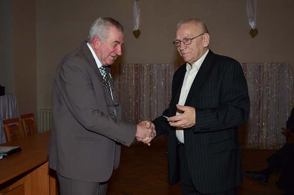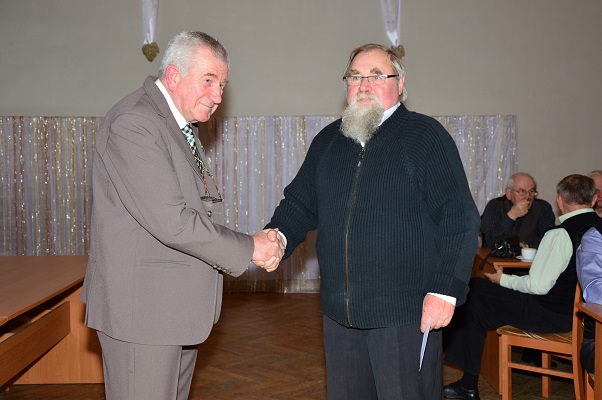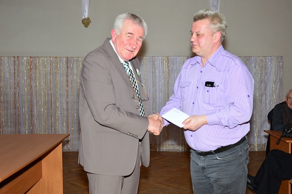 Życzenia z rąk sekretarza Koła mjr w st. spocz. Piotra Szymczaka odbiera mł. chor. w st. spocz. Ryszard Koniecko. |