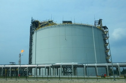| Widok z latarni na Fort Gerharda i rurociągi gazoportu w Świnoujściu. | Widok z latarni na terminal LNG w Świnoujściu, popularnie określany jako gazoport. | |||