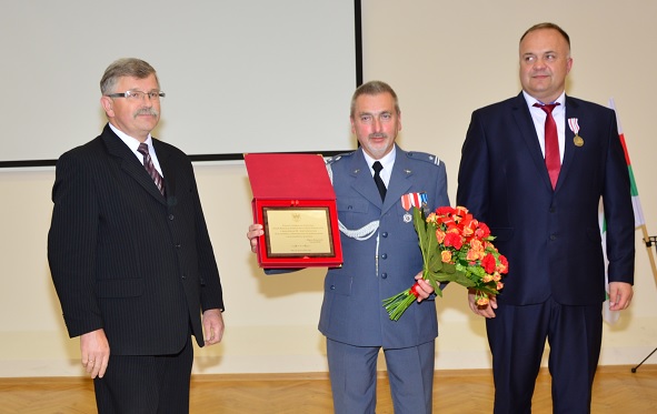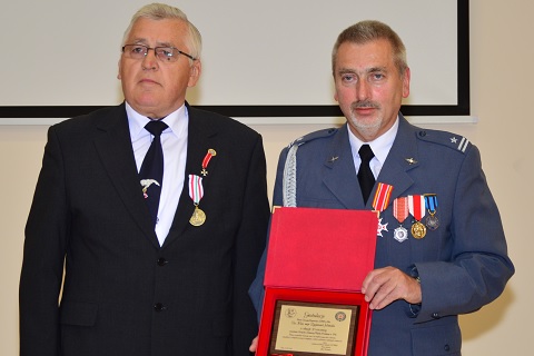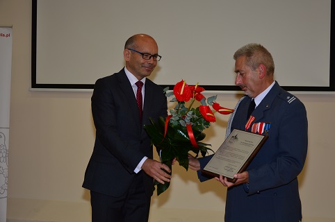 Starosta Pilski Eligiusz Komarowski wraz z Wiceprzewodniczącym Rady Powiatu Panem Romanem Sobieszczykiem wręczyli mjr Zygmuntowi Jelińskiemu kwiaty i pamiątkowy grawerton. |