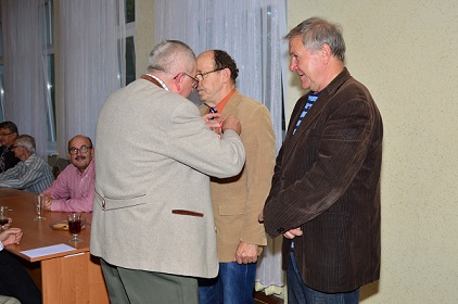 | Sekretarz Koła mjr Piotr Szymczak odznacza Kolegę ppłk Marka Kiersztyna. Obok st. chor. sztab. Jerzy Poszepczyński. | Pamiątkowe zdjęcie z wyróżnionymi. Ppłk Marek Kiersztyn, mjr Piotr Szymczak, st. chor. sztab. Jerzy Poszepczyński. | |||