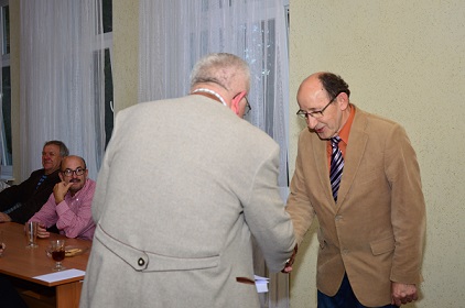 | Kolega ppłk Marek Kiersztyn odebrał z rąk Sekretarza Koła mjr Piotra Szymczaka życzenia z okazji 65-tej Rocznicy Urodzin. | Jubilat podziękował za złożone życzenia i zaprosił uczestników na lampkę szampana. | |||