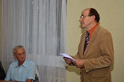 Sekretarz Koła mjr Piotr Szymczak wręcza życzenia Solenizantom. | |||