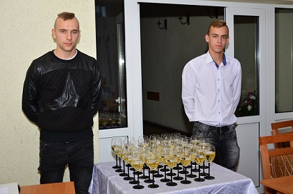 Jubilat ppłk Marek Kiersztyn poczęstował uczestników lampką szampana. W sprawnym podawaniu kieliszków pomaga Kolega Krzysztof Ślusarczyk. |